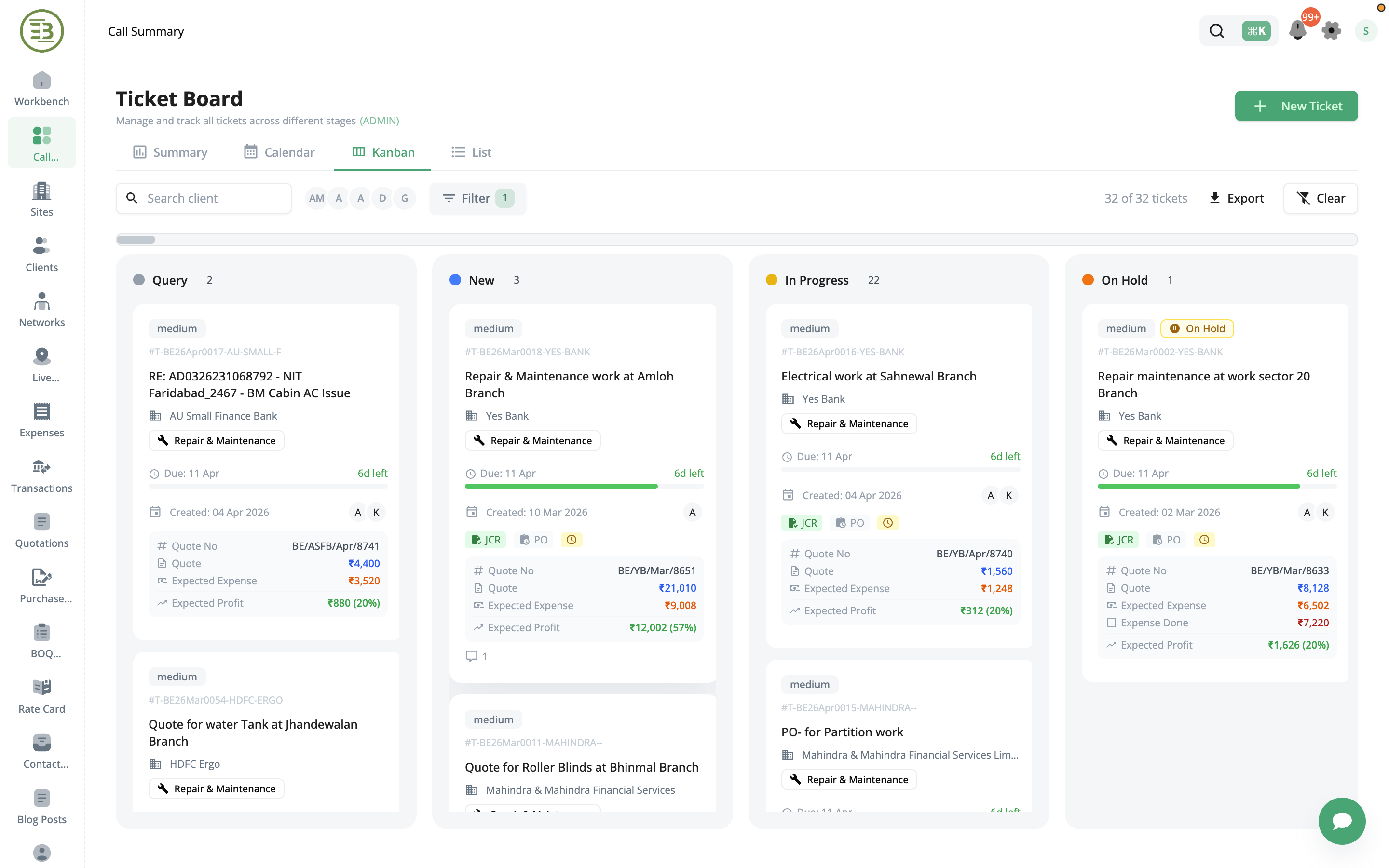 An in-house business platform built for real operations — project tracking, service tickets, and field monitoring in one interface.